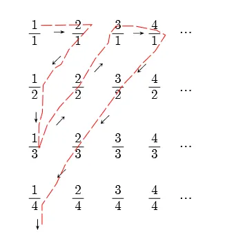 把正有理数排列成如上图形式的阵列。其中,第一行依大小次序包括所有以1为分母的正分数,即全体正整数;第二行依大小次序包括所有以2为分母的正分数;第三行依大小次序包括所有以3为分母的正分数……显然,每个正有理数都出现在这个阵列中(因为有理数就是分数)。必须注意的是,其中有些有理数是重复出现的。现在我们从1/1开始,按照箭头所示的方向依次指定1对应1/1 ,2对应2/1 ,3对应1/2,4对应1/3……每一个有理数必将在某一步对应于一个被指定的自然数。于是,上面列出的有理数集合与自然数集合构成一一对应。把重复的去掉后,这个有理数集合仍然是一个无穷集合。从而必然是可数的,因为可数集合是最小的无穷集合。